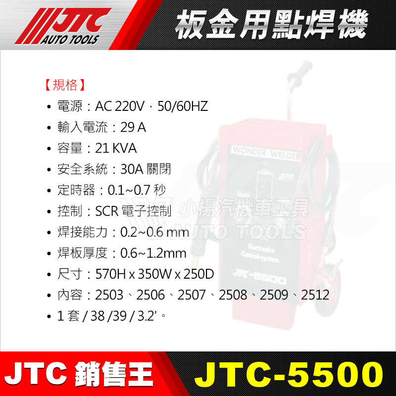 • 內容:JTC-2503 點焊鉤倒盾組、JTC-2506 5500華司夾頭、JTC-2507 點焊頭、JTC-2508 熱熔頭、JTC-2509 碳棒、JTC-2512 銅華司