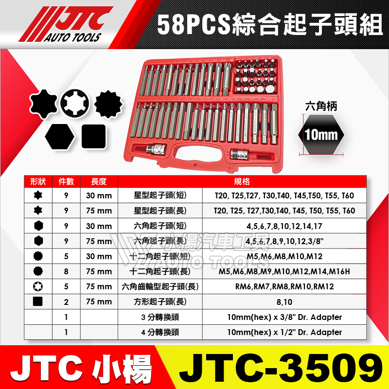 9件75mmL星型起子頭(長):T20,T25,T27,T30,T40,T45, T50,T55,T60。