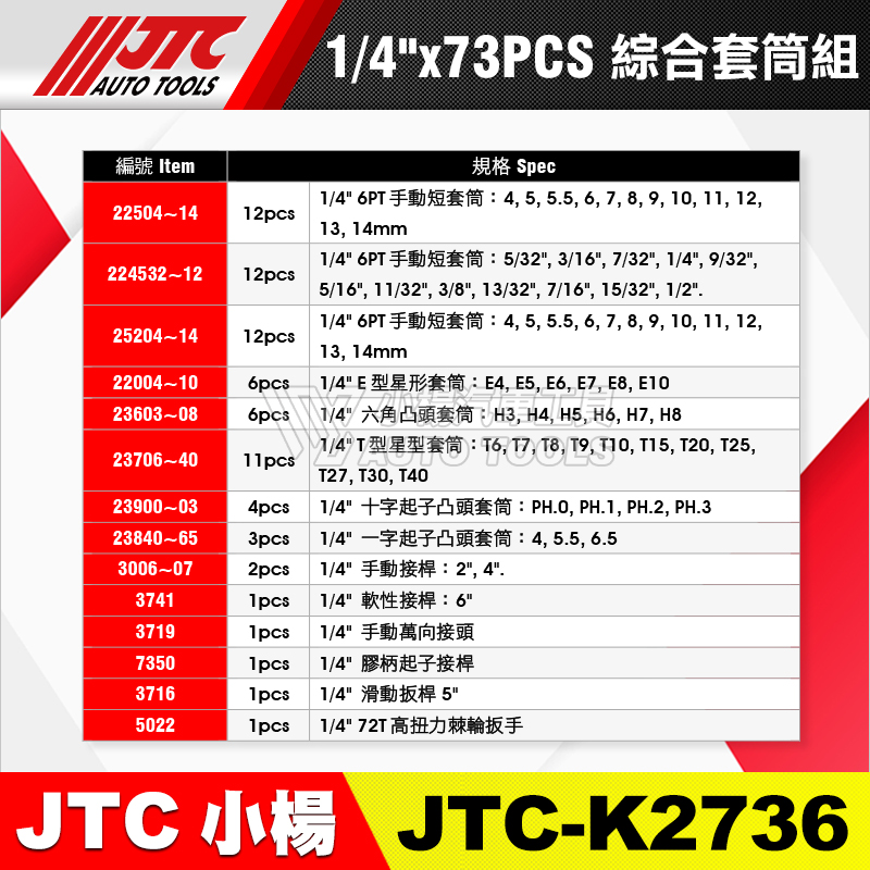 JTC-K2736 1/4"(2分) 73PCS 綜合套筒組(有蓋子)
