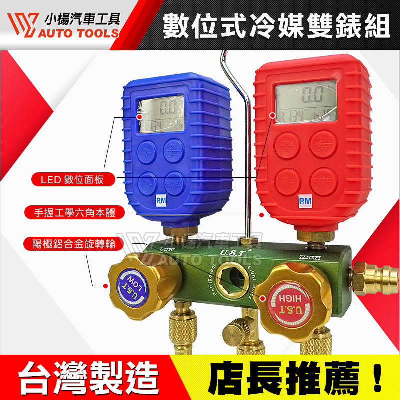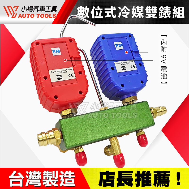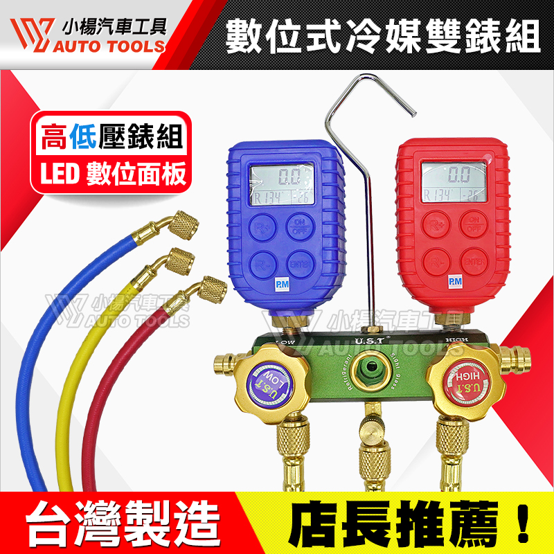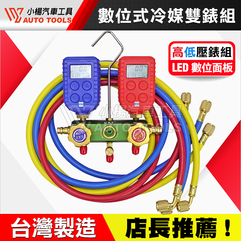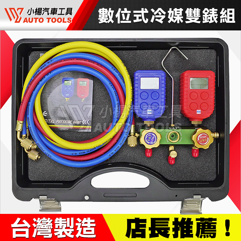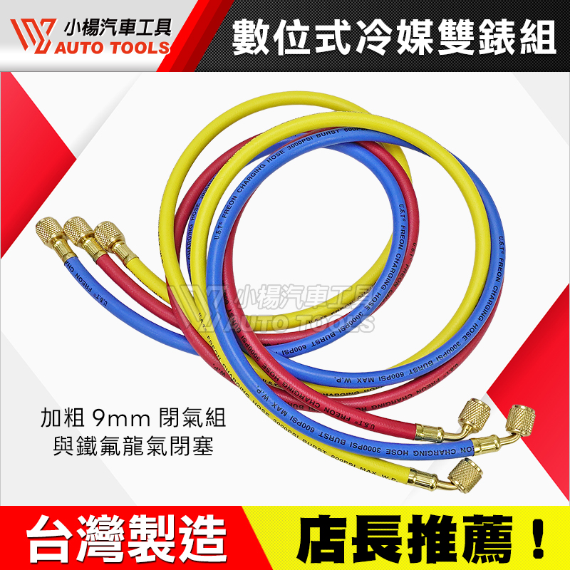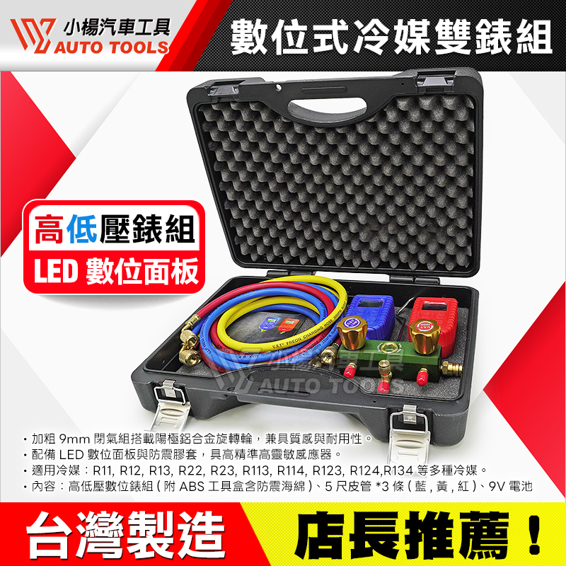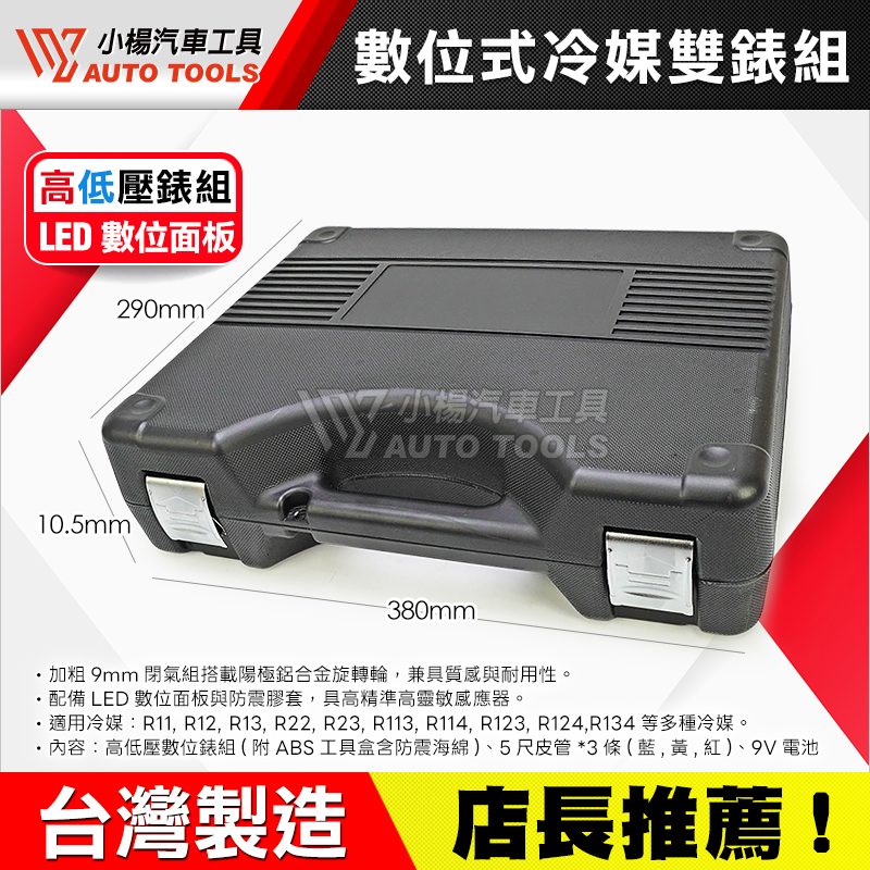 •內容:高低壓數位錶組(附ABS工具盒含防震海綿)、5尺皮管*3條(藍,黃,紅)、9V電池