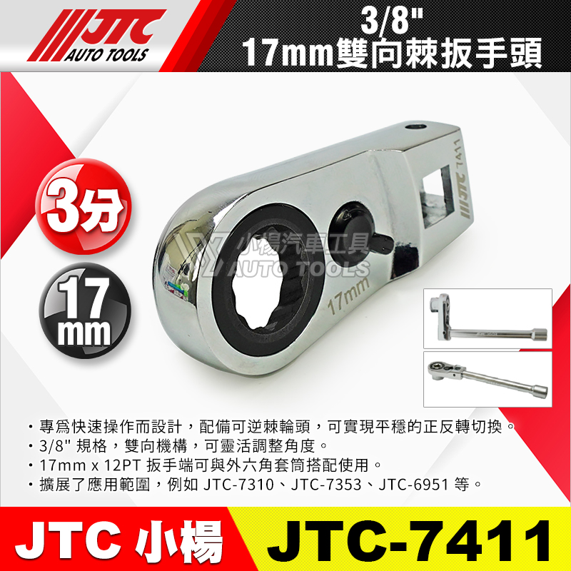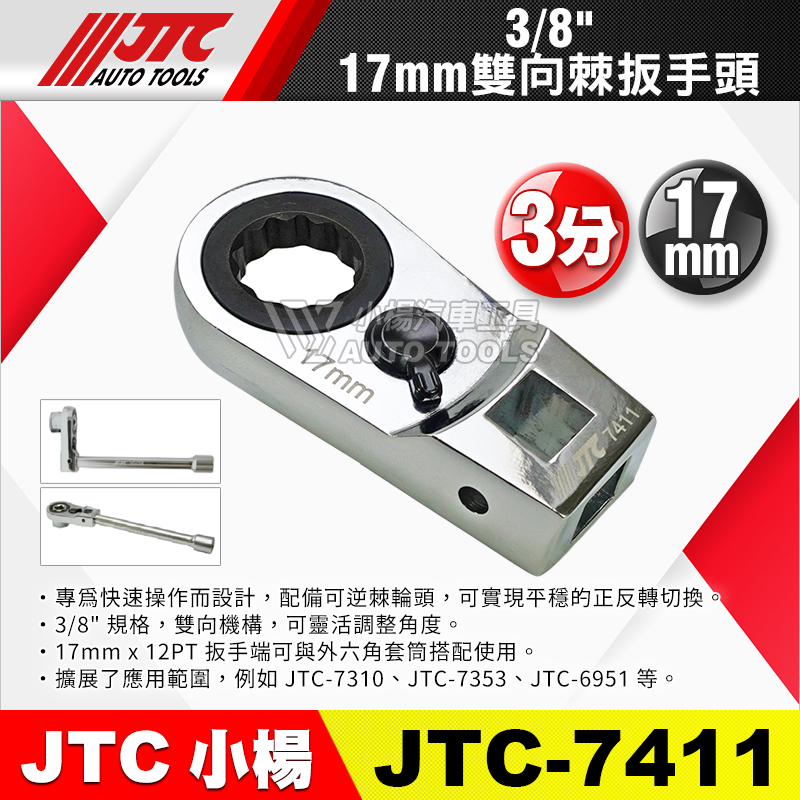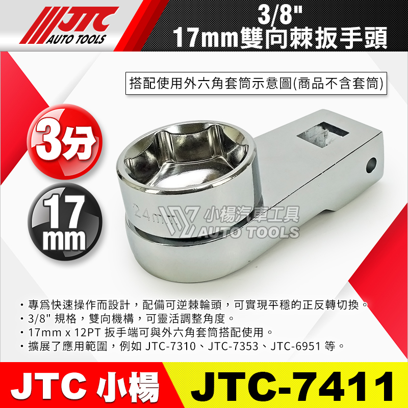 • 17mm x 12角扳手端,可與直通式套筒(外六角套筒)搭配使用,增加使用範圍,例如 JTC-7310、JTC-7353、JTC-6951 等。
