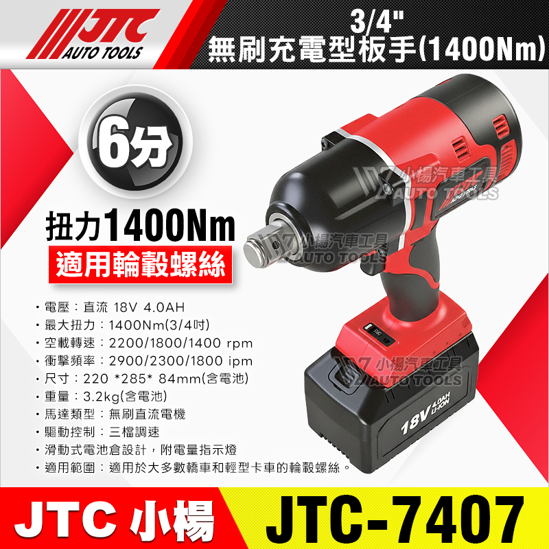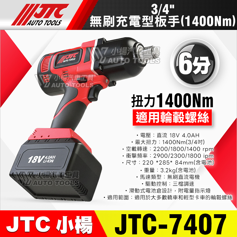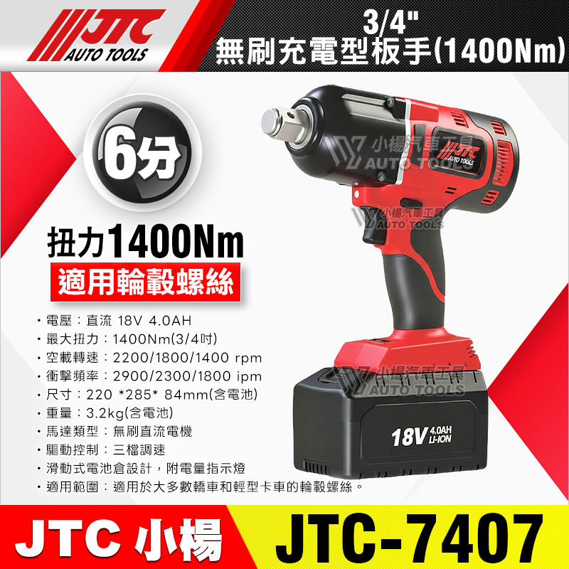 • 電壓:直流 18V 4.0AH。 • 最大扭力:1400 Nm(3/4 吋) • 空載轉速:2200 / 1800 / 1400 rpm。 • 衝擊頻率:2900 / 2300 / 1800 ipm。 • 尺寸:220 x 285 x 84 mm(含電池)。 • 重量:3.2公斤(含電池)。 • 馬達類型:無刷直流馬達。 • 驅動控制:三檔調速控制。 • 滑動式電池倉設計,附電量指示燈。 • 適用範圍:適用於大多數轎車和輕型卡車的車輪螺絲。