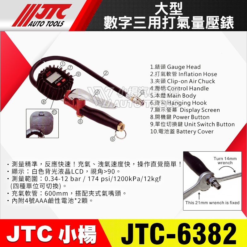 • 自動開機:搭載壓差感應自動開機功能,將夾式打氣頭固定於輪胎氣嘴後,2秒內自動開機顯示胎壓。