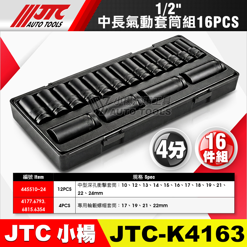 12 件:1/2" 中長氣動套筒:10、12、13、14、15、16、17、18、19、21、22、24mm